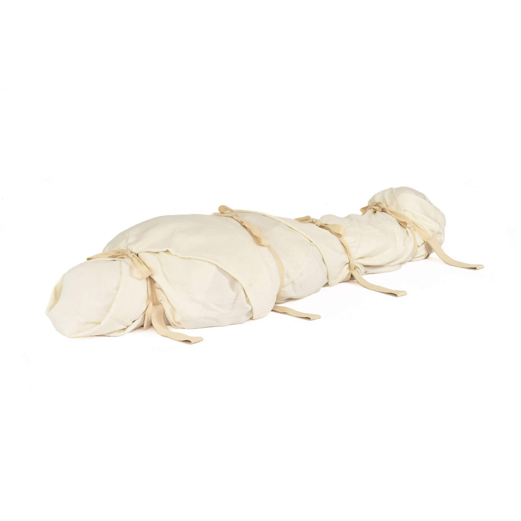 Burial shrouds have been used for centuries made from materials such as wool, hemp, flax and even silk. Our shrouds are made from tightly woven, unbleached cotton yarn, a highly sustainable and renewable material.